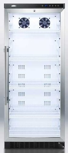 Summit Stainless Steel Freestanding Beverage Center SCR1155. ETL-S listed to NSF standards for commercial use. Keyed lock for secure interior. Heat-safe glass door offers full display all the way down to the floor. Energy efficient lighting offers full view of interior. Electronic controls for precise temperature management with a readout in Celsius or Fahrenheit. Temperature range: 34 - 43*F. User reversible door swing. Solid chrome handle with brushed stainless steel look. Rearrange refrigerator space to accommodate all sizes or remove shelves for simple cleanup. No-frost system simplifies maintenance. Environmentally friendly design with no ozone-damaging chemicals. Capacity: 11.0 Cu. Ft. Defrost Type: Frost-Free. Door Swing: Right Hinge. Reversible Door: Yes. Shelf Quantity: 4. Adjustable Shelf: Yes. Shelf Type: Wire. Light: Yes. Thermostat Type: Digital. Fan Type: Interior. Level Legs Quantity: 4. High Side PSI: 270.0. Low Side PSI: 103.0. Freon Type: R134a. Freon Oz.: 3.88 Oz. Amps: 2.8 Amps. Voltage: 115V AC. Frequency: 60 Hz. Sanitation: ETL-S. Canadian Electrical Safety: ETL-C. US Electrical Safety: ETL. Compressor Warranty: 5 Years. Parts/Labor Warranty: 1 Year. Overall Width: 23 3/5. Overall Depth: 24 1/10. Overall Depth without Handle: 22 1/4. Overall Depth with Door 90*: 44 1/2. Overall Height: 57. Weight: 153.0 Lbs. Something For Everyone Today, SUMMIT carry over 600 models of specialty refrigerators and freezers, including the largest range of fully automatic defrost compacts available on the market. Additionally, their product line consists of ranges, microwave ovens, cooktops, combination kitchens, washers and dryers, beer dispensers, wine cellars, and more. With their expanding line of built-in and freestanding units, SUMMIT serves a variety of household, commercial, and scientific markets. Specialized compact products for offices, schools, and food service establishments, refrigerators and freezers for medical and laboratory storage, minibars for
