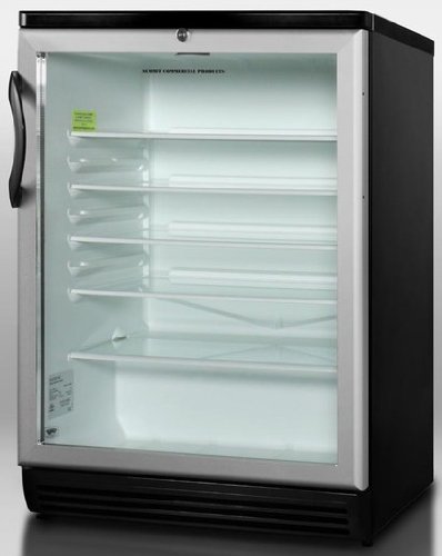 Summit Stainless Look Freestanding Beverage Center SCR600BLHV. ETL-S Approved to ANSI-NSF Standard 7 and CalCode Compliant. Less than 24 wide to fit tight spaces. Allows the unit to be used freestanding. Heat resistant design provides clear view to promote impulse buys. Keep contents secure with a key lock on the door. Turn the light on when you need it and off when you're done with a convenient rocker switch. Simplify appliance care by letting the refrigerator defrost itself. SUMMIT's original hidden evaporator is concealed in the wall so it never touches your fingers or food. Enjoy easy clean-up with a seamless liner that won't hold a mess in hidden crevices. Rearrange your refrigerator space to accommodate all shapes and sizes or remove shelves for a simple clean-up. Manage the interior temperature with ease and accuracy. Environmentally friendly design without ozone-damaging chemicals. Capacity: 5.5 Cu. Ft. Energy Usage/Year: 434.0 kWh/Year. Defrost Type: Automatic. Fan Type: Exterior. Thermostat Type: Dial. Reversible Door: No. Shelf Quantity: 4. Adjustable Shelves: Yes. Shelf Type: Glass. Light: Yes. Level Legs Quantity: 2. Freon Type: R134a. Freon Oz.: 1.8 Oz. High Side PSI: 285.0. Low Side PSI: 70.0. Compressor Warranty: 5 Years. Parts/Labor Warranty: 1 Year. Sanitation: ETL-S. US Electrical Safety: UL. Canadian Electrical Safety: ULC. Overall Width: 23 5/8. Overall Depth: 25 1/2. Overall Depth without Handle: 23 1/2. Overall Depth with Door 90*: 46. Overall Height: 33 1/2. Interior Width: 20 3/4. Interior Depth: 17 1/2. Interior Height: 26. Comp Step Width: 20 3/4. Comp Step Depth: 5. Comp Step Height: 6. Shipping Weight: 120.0 Lbs. Something For Everyone Today, SUMMIT carry over 600 models of specialty refrigerators and freezers, including the largest range of fully automatic defrost compacts available on the market. Additionally, their product line consists of ranges, microwave ovens, cooktops, combination kitchens, washers and dryers, beer dispensers, wi