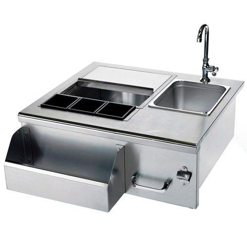 High quality stainless beverage center for the great appearance and durability you want in your summer kitchen. Comes complete with solid stainless steel construction for years of use outdoors, with separate sink and faucet, bottle opener and speed r