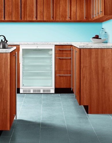 Built in Undercounter Glass Door with Lock is a high quality under-counter glass door all-refrigerator with a front mounted lock and fully automatic defrost. It meets ANSI-NSF standard 7 for commercial use and is ETL-S listed. The Beverage Cooler features Summit 's unique hidden evaporator (behind the rear wall) allowing a seamless interior liner, and accepting some of the largest shelves in the industry. It is available in different door swing and handles. No internal fans are provided and it is 100 percent CFC free. It works by utilizing 115 volts/ 60 hertz of power.