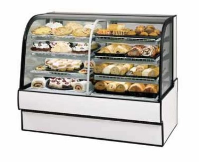 Curved Glass Vertical Dual Zone Bakery Case Refrigerated Left Non-Refrigerated Right (77öL x 35öW x 42öH), self contained refrigeration with condensate evaporator, adjustable temperature control, curved thermopane tilt-front glass, top light and lighted shelves, two tiers of adjustable white wire shelves, glass sliding rear doors, white interior, tempered glass ends, choice of laminate with black trim, designed for