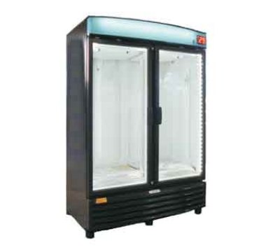 Beer Cooler, two-section, 42 cu. ft., (2) anti-fog self-closing glass door, forced air w/automatic defrost, bottom-mount refrigeration, temperature range 26 to 30F, (10) shelves, interior light, holds (630) 12 oz. cans, black enamel exterior, white interior, 1/2 hp, 115/120v/60/1-ph, 10.5amps, NEMA 5-15P, ETL