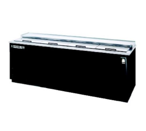 Frosty Brew Bottle Cooler, flat top, 95" L, self-contained refrigeration system, holds below 32 F, deep well design, 4 sliding doors, black vinyl exterior, galvanized interior, s/s top.