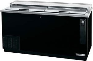 Bottle Cooler, flat top, 65" L, self-contained refrigeration system, deep well design, 2 sliding doors, black vinyl exterior, galvanized interior, s/s top.
