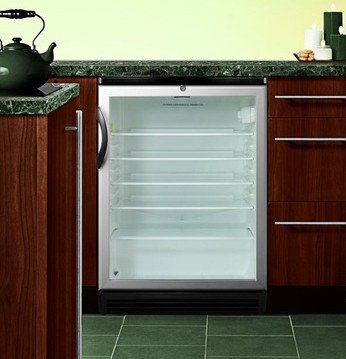 Summit Stainless Look Built In Beverage Center SCR600BLBIHV. ETL-S Approved to ANSI-NSF Standard 7 and CalCode Compliant. Less than 24 wide to fit tight spaces. Make the best use of space by installing your appliance under the counter and flush with other cabinets. Allows the unit to be used freestanding. Heat resistant design provides clear view to promote impulse buys. Keep contents secure with a key lock on the door. Turn the light on when you need it and off when you're done with a convenient rocker switch. Simplify appliance care by letting the refrigerator defrost itself. SUMMIT's original hidden evaporator is concealed in the wall so it never touches your fingers or food. Enjoy easy clean-up with a seamless liner that won't hold a mess in hidden crevices. Rearrange your refrigerator space to accommodate all shapes and sizes or remove shelves for a simple clean-up. Manage the interior temperature with ease and accuracy. Environmentally friendly design without ozone-damaging chemicals. Capacity: 5.5 Cu. Ft. Energy Usage/Year: 434.0 kWh/Year. Defrost Type: Automatic. Fan Type: Exterior. Thermostat Type: Dial. Reversible Door: No. Shelf Quantity: 4. Adjustable Shelves: Yes. Shelf Type: Glass. Light: Yes. Level Legs Quantity: 4. Freon Type: R134a. Freon Oz.: 1.8 Oz. High Side PSI: 285.0. Low Side PSI: 70.0. Compressor Warranty: 5 Years. Parts/Labor Warranty: 1 Year. Sanitation: ETL-S. US Electrical Safety: UL. Canadian Electrical Safety: ULC. Overall Width: 23 5/8. Overall Depth: 25 1/2. Overall Depth without Handle: 23 1/2. Overall Depth with Door 90*: 46. Overall Height: 33 1/2 - 34 1/2. Interior Width: 20 3/4. Interior Depth: 17 1/2. Interior Height: 26. Comp Step Width: 20 3/4. Comp Step Depth: 5. Comp Step Height: 6. Shipping Weight: 122.0 Lbs. Something For Everyone Today, SUMMIT carry over 600 models of specialty refrigerators and freezers, including the largest range of fully automatic defrost compacts available on the market. Additionally, their product l